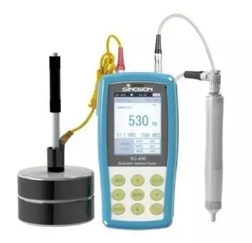SU-400里超硬度计是一款结合动态反弹里氏测量方法和静态超声波维式测量方法的二和一便携式硬度计,SU-400不仅可以支持超声波手动1Kg,2 Kg,5 Kg,10 Kg探头和电动0.3 Kg,和1Kg探头进行超声波接触阻抗法测量,而且还支持里氏测量的7种动态冲击装置,即D,DC,DL,D+15,C,E,G进行动态里氏反弹测量。可以用超声的方法测量比较薄、粗糙度比较好的试样,也可以用里氏方法测量比较粗糙的试样。在一台机器上,不仅用超声的方法弥补了里氏硬度计无法测量电镀层和硬度层试样的难题,还用里氏的方法弥补了超声波不好测量粗晶材料硬度的问题。